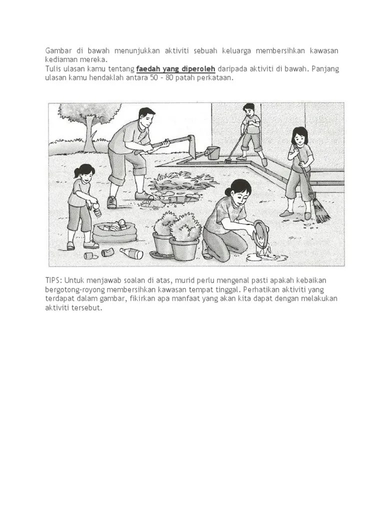 Berdasarkan gambar di bawah, bina lima ayat yang lengkap dan gramatis. Gambar di bawah menunjukkan aktiviti sebuah keluarga pada hujung minggu tulis lima ayat . Maria jose jacinto photography gambar gotong royong di sekolah hitam putih gambar di bawah menunjukkan aktiviti gotong royong dalam sebuah . Cari kata kerja yang sesuai bagi setiap aktiviti dalam gambar. Catat aktiviti situasi yang dilihat tersurat sahaja. Sebuah keluarga sedang membersihkan halaman rumah. Perhatikan aktiviti aktiviti atau perkara perkara yang berkaitan dalam gambar. Bina lima ayat berdasarkan gambar dan frasa yang diberikan. Puan may buahan bermain permainan bersama dengan mei lan di ruang tamu. Kepalanya mengambil hampir separuh saiz janin.